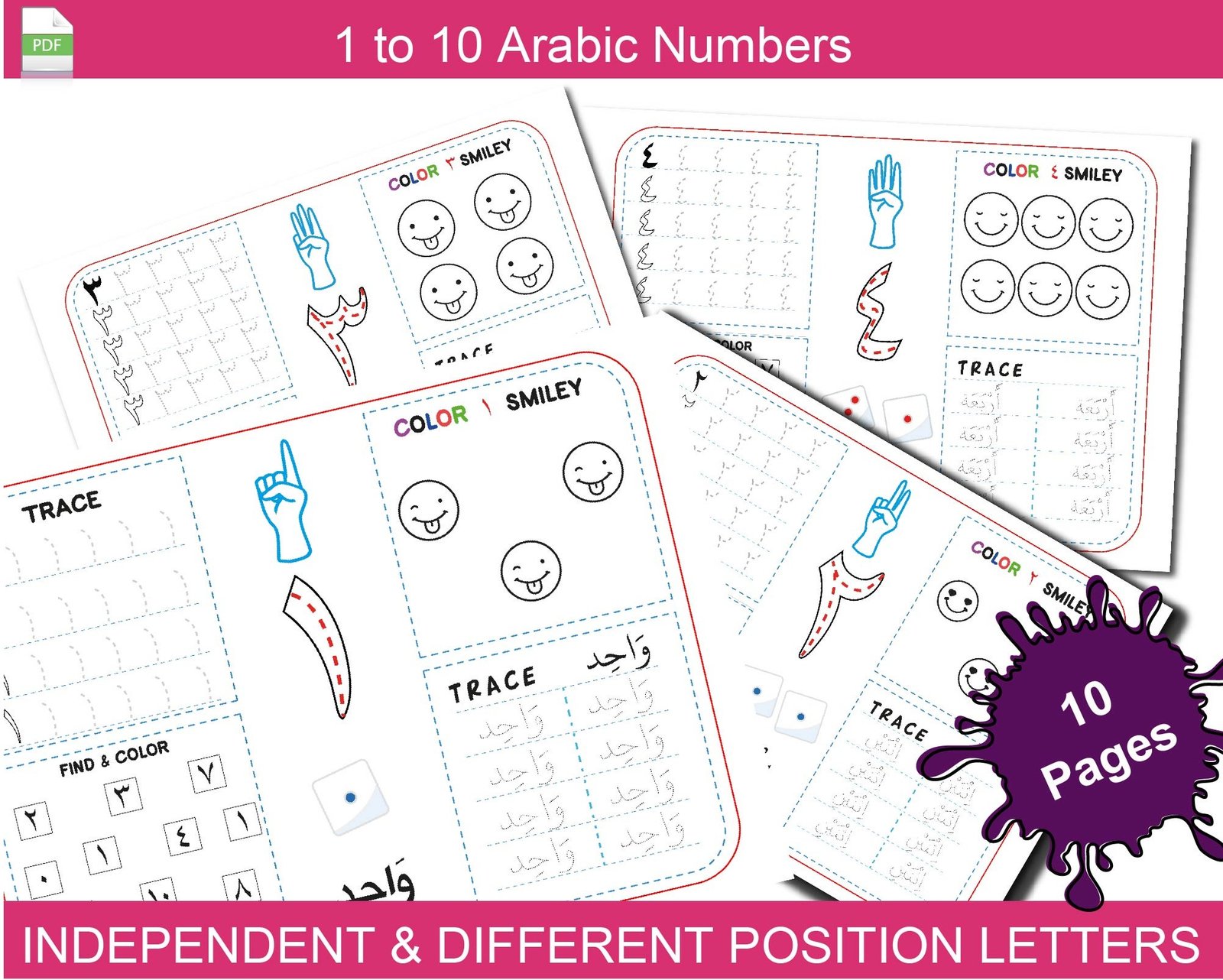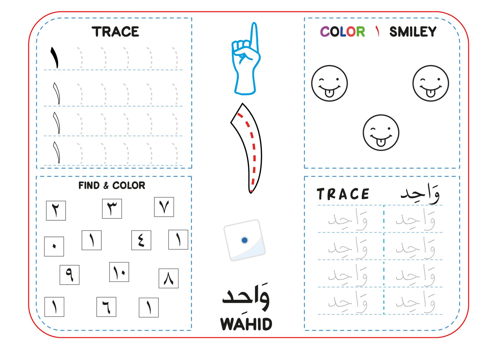 Fun and educational Arabic numbers 1 to 10 printable worksheet for kids! Includes tracing, finger counting, English pronunciation, find-and-color activities, and more—perfect for toddlers and early learners.